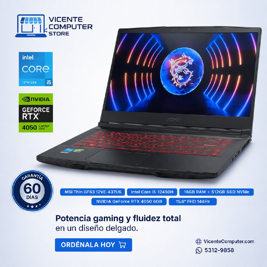 Lleva tu juego, estudio y trabajo a otro nivel con esta laptop gaming delgada y potente. La MSI Thin GF63 12VE-437US combina el rendimiento del Intel Core i5 de 12ª generación con gráficos NVIDIA GeForce RTX 4050, ideal para gaming competitivo, edición ligera, multitarea exigente y uso profesional con excelente fluidez.
