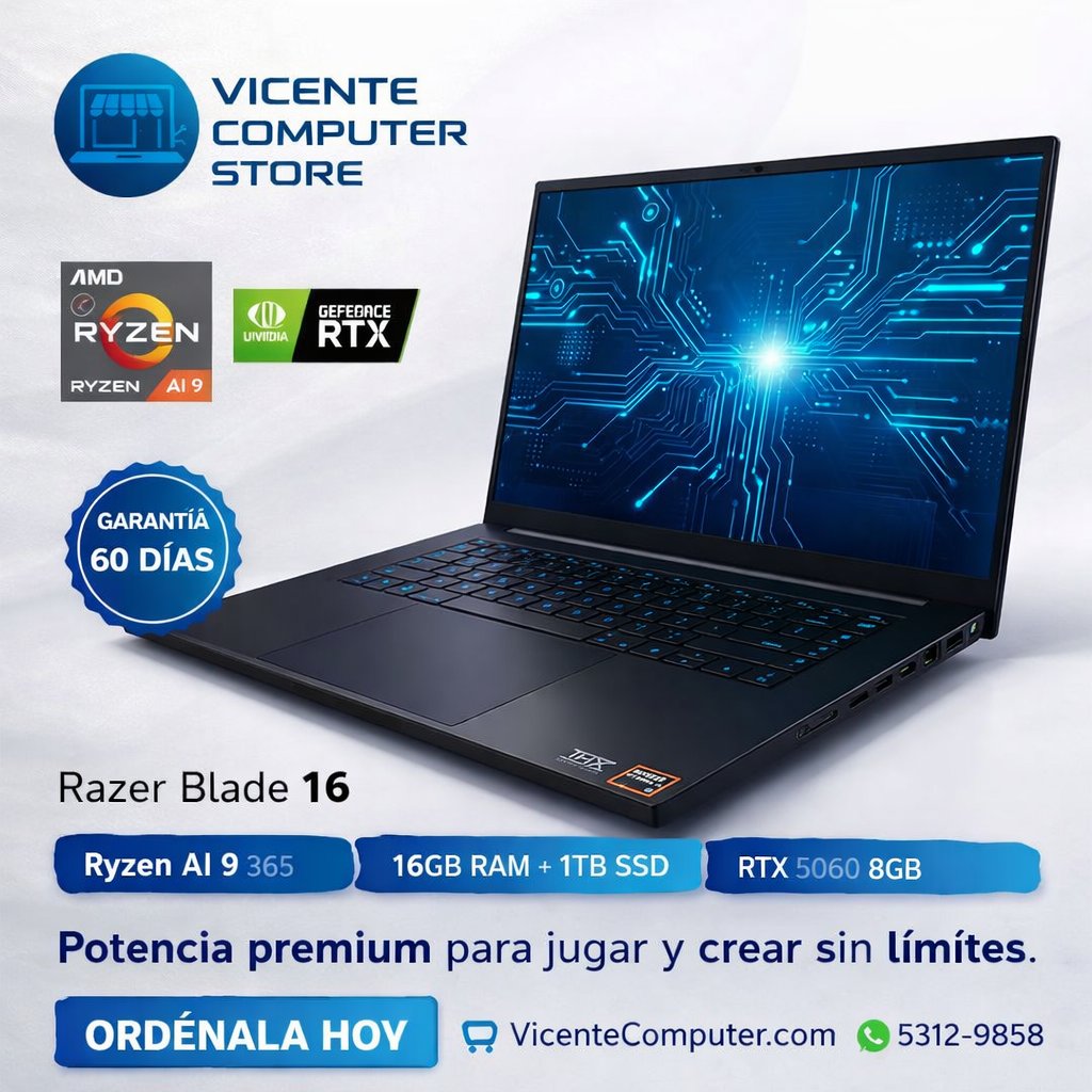 La Razer Blade 16 es una laptop gaming y profesional de alto nivel, pensada para usuarios que buscan potencia real en un chasis delgado, elegante y premium. Esta configuración combina el AMD Ryzen AI 9 365 con gráficos NVIDIA GeForce RTX 5060, ideal para gaming moderno, creación de contenido, multitarea exigente y trabajo avanzado.